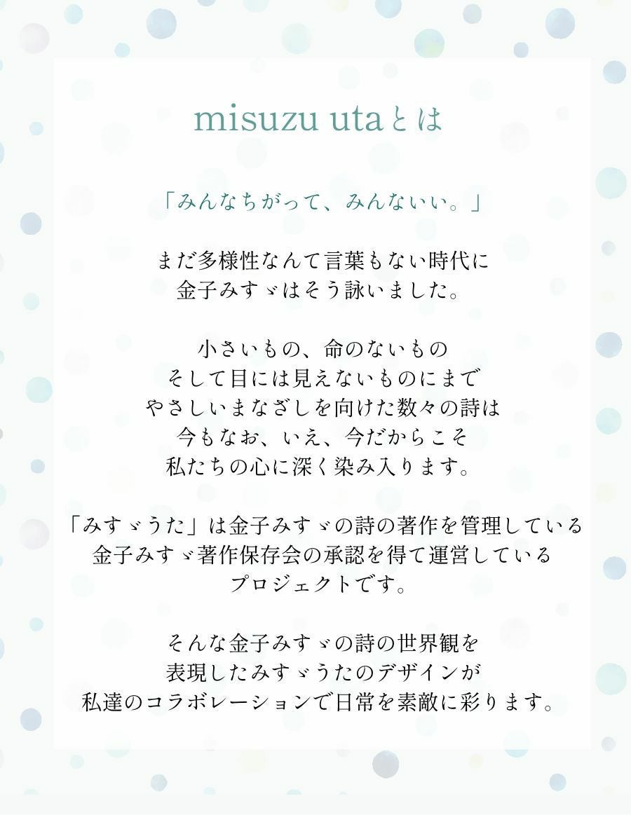 「みんなちがって、みんないい。」 まだ多様性なんて言葉もない時代に 金子みすゞはそう詠いました。 小さいもの、命のないもの そして目には見えないものにまで やさしいまなざしを向けた数々の詩は 今もなお、いえ、今だからこそ 私たちの心に深く染み入ります。 「みすゞうた」は金子みすゞの詩の著作を管理している 金子みすゞ著作保存会の承認を得て運営している プロジェクトです。 そんな金子みすゞの詩の世界観を 表現したみすゞうたのデザインが 私達のコラボレーションで日常を素敵に彩ります。