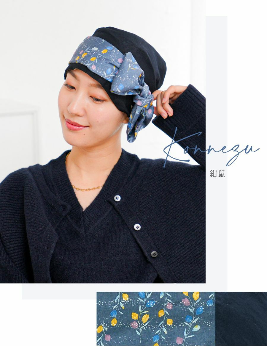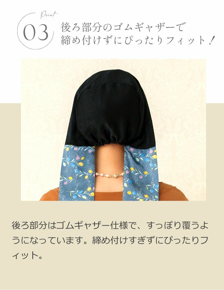 ハリのある生地と、柔らかさにこだわった最高級の2つの生地を切り返すことで、 無地×柄でよりスタイリッシュな印象を実現しました。ベーシックラインより贅沢に生地を使用しているので襟足で結んだ時のボリュームが増え、より華やぎます。 かぶった時の頭のシルエットにも徹底的にこだわり、帽子のようにお手軽にかぶっていただけます。