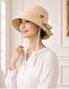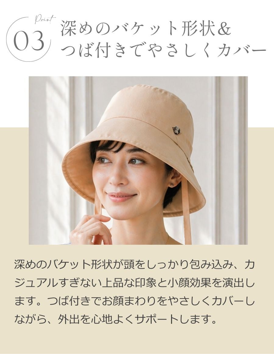 深めのバケット形状が頭をしっかり包み込み、カジュアルすぎない上品な印象と小顔効果を演出します。つば付きでお顔まわりをやさしくカバーしながら、外出を心地よくサポートします。