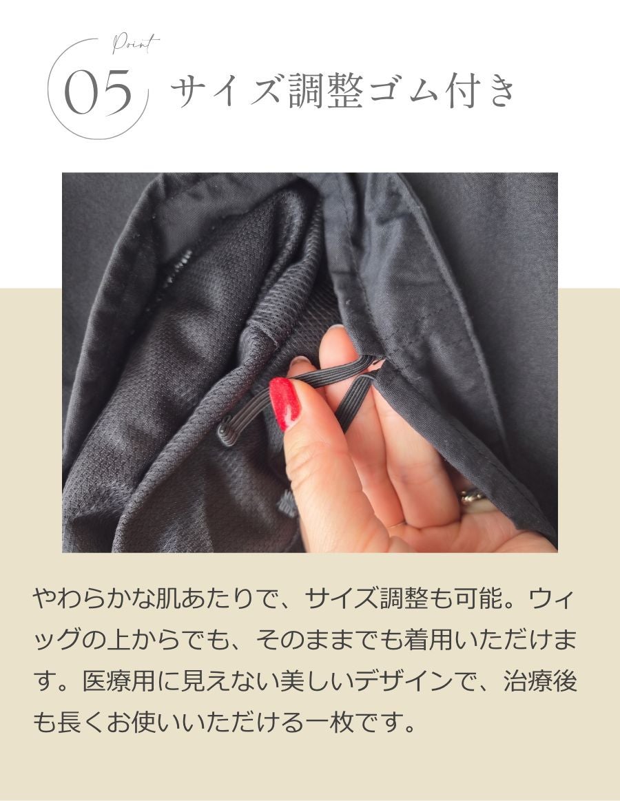 やわらかな肌あたりで、サイズ調整も可能。ウィッグの上からでも、そのままでも着用いただけます。医療用に見えない美しいデザインで、治療後も長くお使いいただける一枚です。