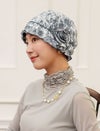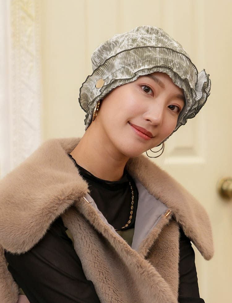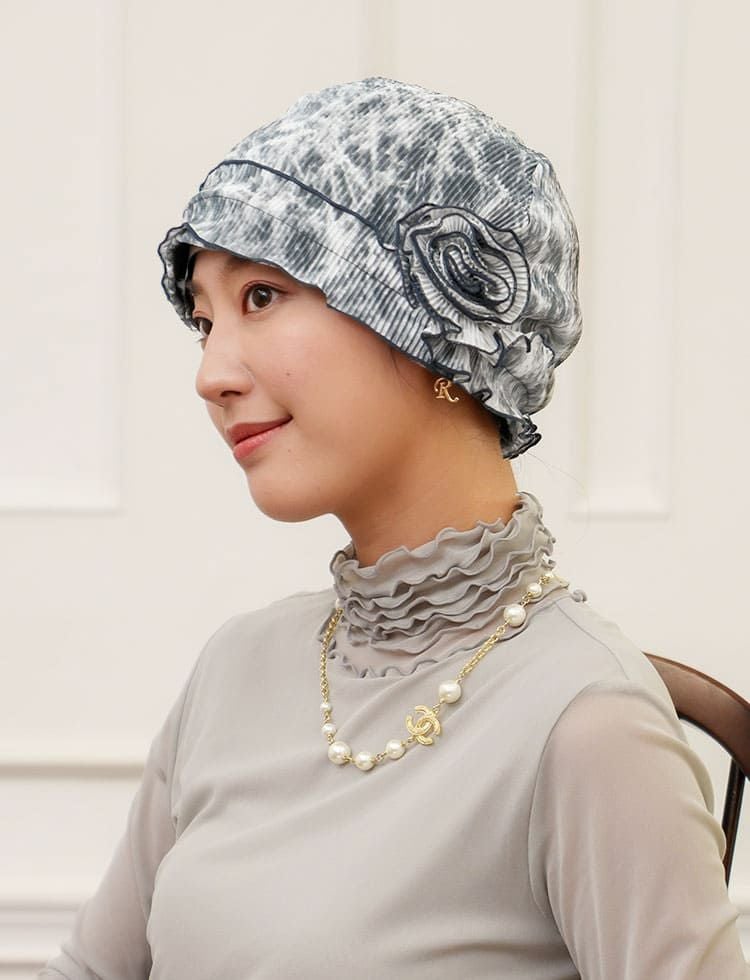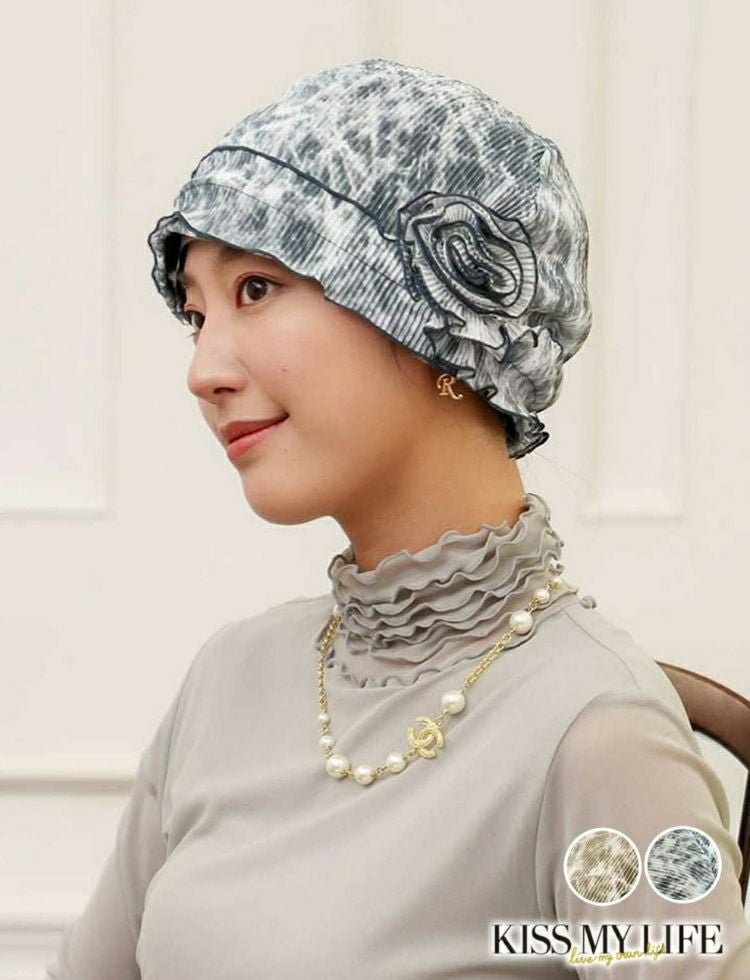 【セール】医療用帽子(ケア帽子) -Jean- ニットタイプ/プリーツ巻きコサージュ マーブル
