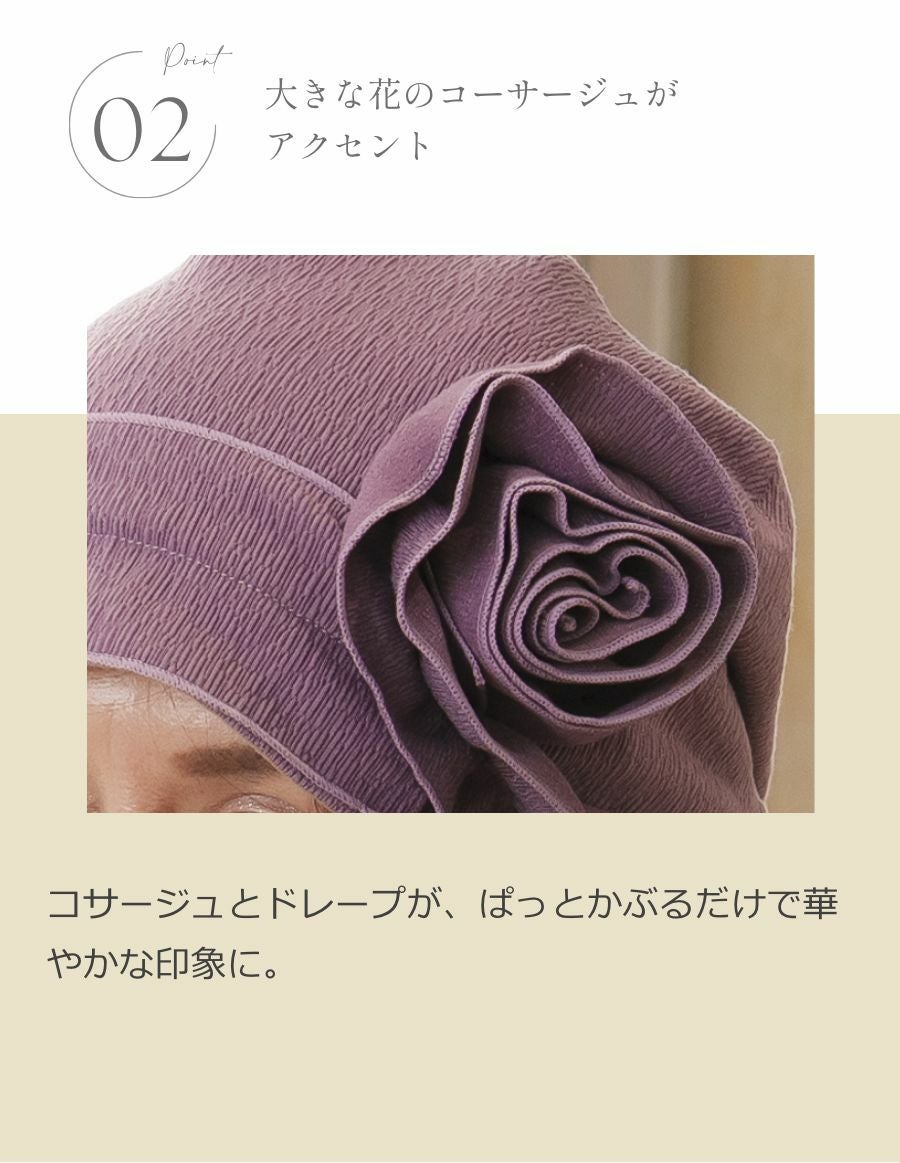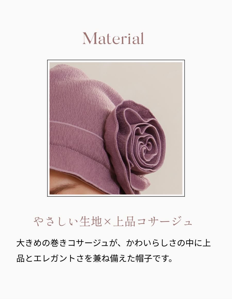 商品について ◎巻きコサージュがアクセントのお洒落なケア帽子