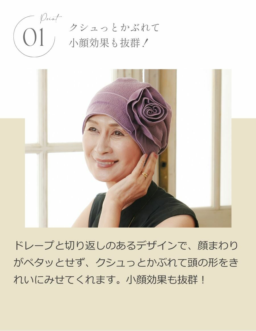ドレープと切り返しのあるデザインで、顔まわりがペタッとせず、クシュっとかぶれて頭の形をきれいにみせてくれます。小顔効果も抜群!