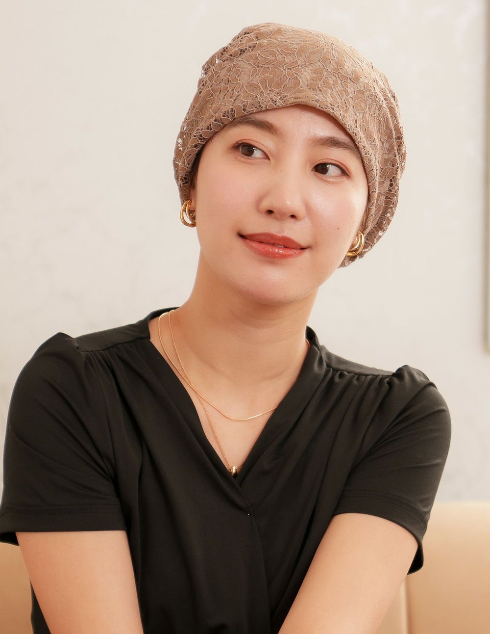 外出時はウィッグを、自宅ではニット帽を着用していますが、こちらはとてもおしゃれなデザインなので急な宅配の訪問でも対応できそうです。