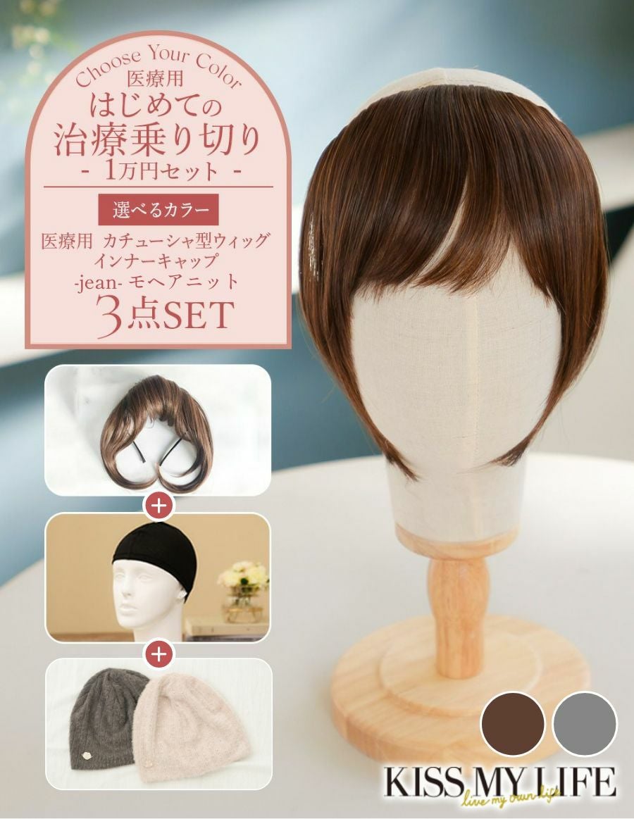 人気の前髪カチューシャタイプウィッグ、モヘアニットの医療用帽子、オーガニック素材のインナーキャップの3点セット!これからの季節にぴったりの商品をお得なセットにしました。