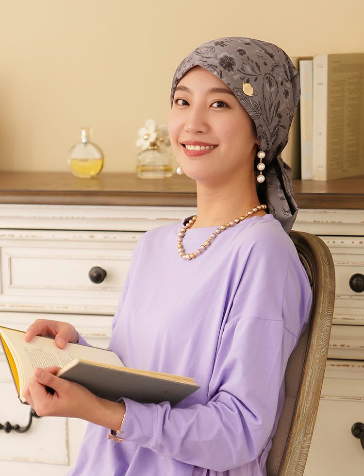 KISS MY LIFEのシグネチャーモデル。スカーフタイプでアレンジも楽しめる、おしゃれな医療用帽子。