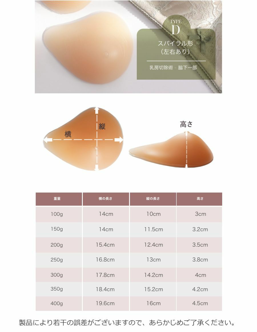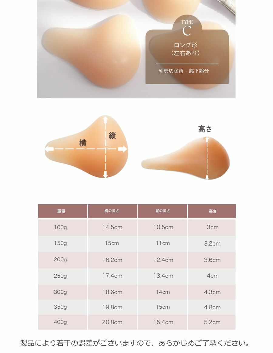 ②ご希望のパッドの形状別の表から、サイズに合った重さを選びます。 実寸サイズに近いか、一つ下のサイズを選ぶと左右のバランスがとりやすいです。 ※製品により若干の誤差がございますので、あらかじめご了承ください。
