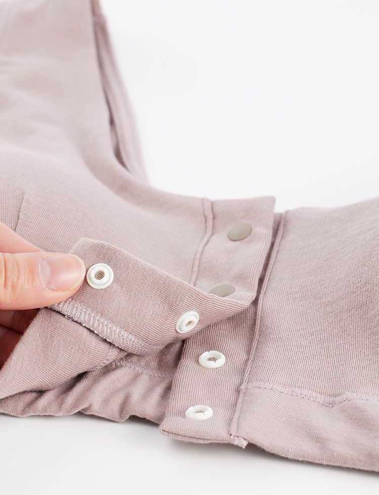 ◎前開きで、ワンタッチでとめられるスナップボタンを使用。