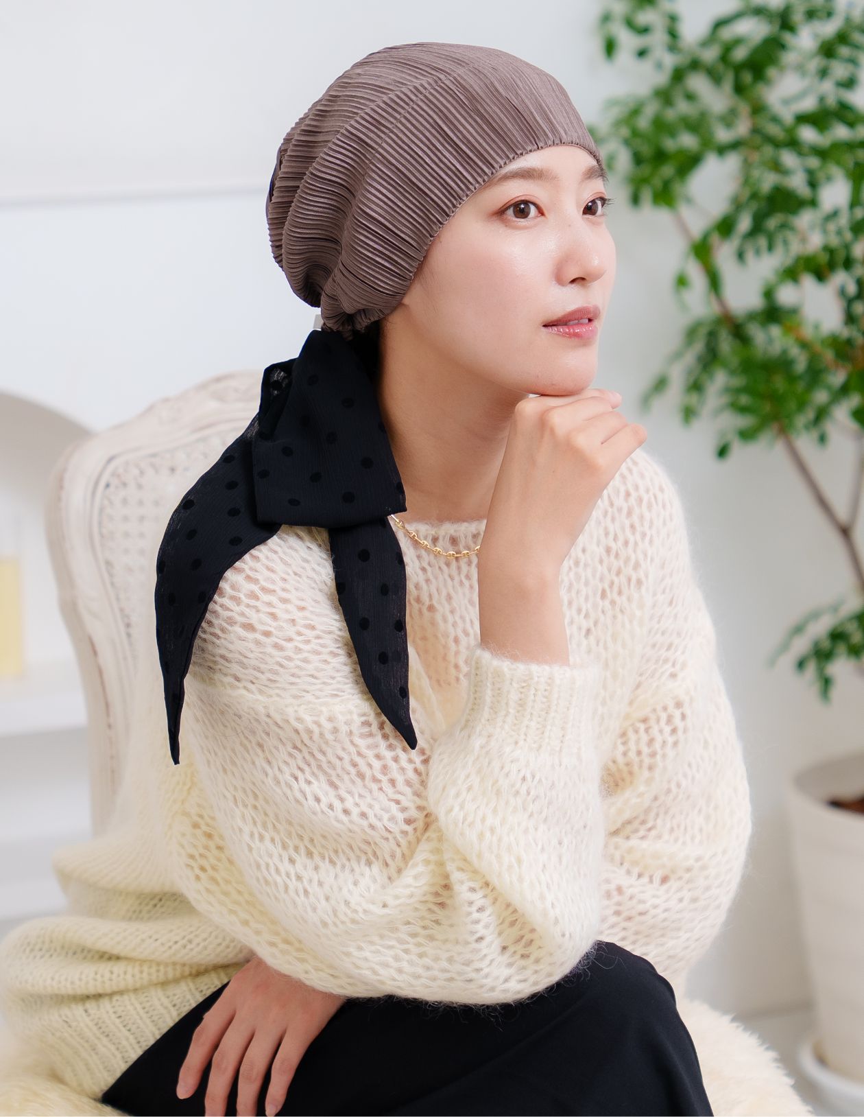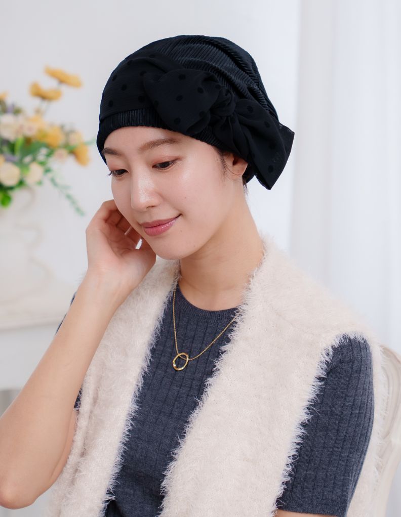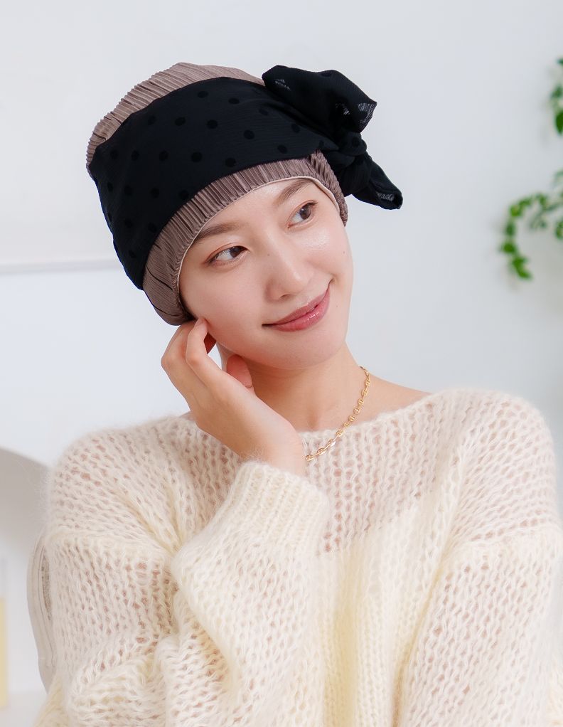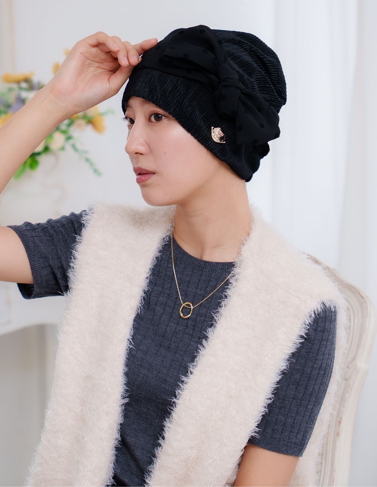 柔らかなドレープに、透けるシフォンが重なり、軽やかな表情に。 上品な艶と立体感が、顔まわりを美しく引き立てます。 シフォンに重ねたドットがオシャレに際立ち、日常にもフォーマルにもなじむ、上質でモダンな大人のための特別な帽子です。