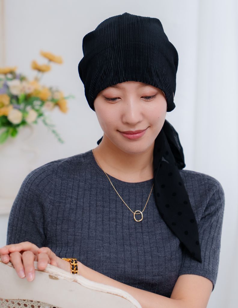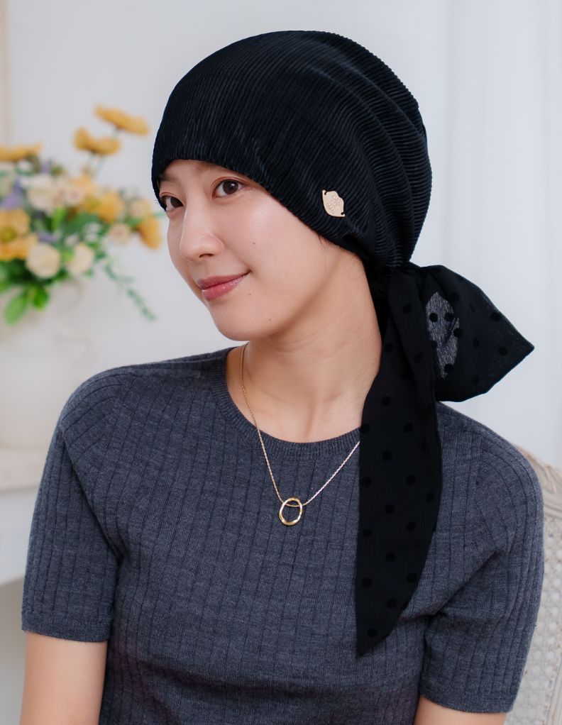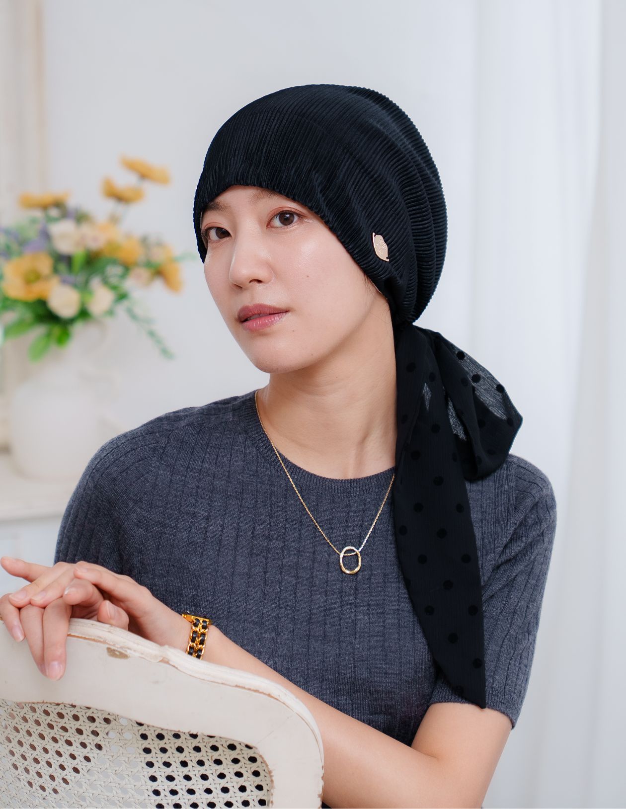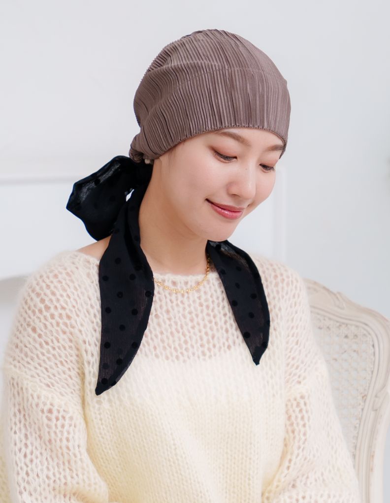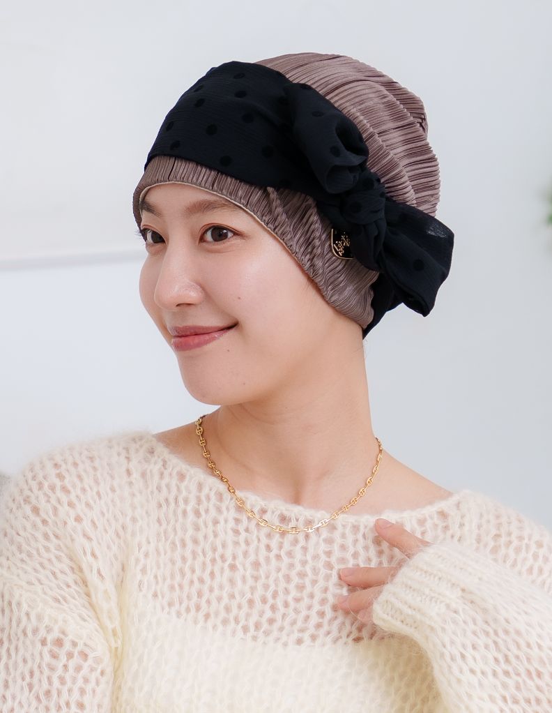 柔らかなドレープに、透けるシフォンが重なり、軽やかな表情に。 上品な艶と立体感が、顔まわりを美しく引き立てます。 シフォンに重ねたドットがオシャレに際立ち、日常にもフォーマルにもなじむ、上質でモダンな大人のための特別な帽子です。