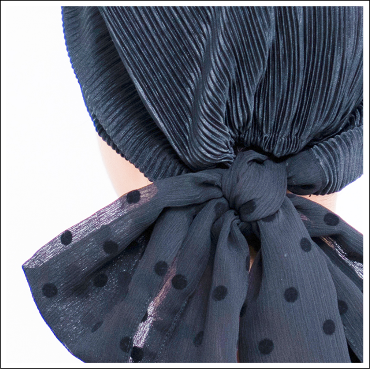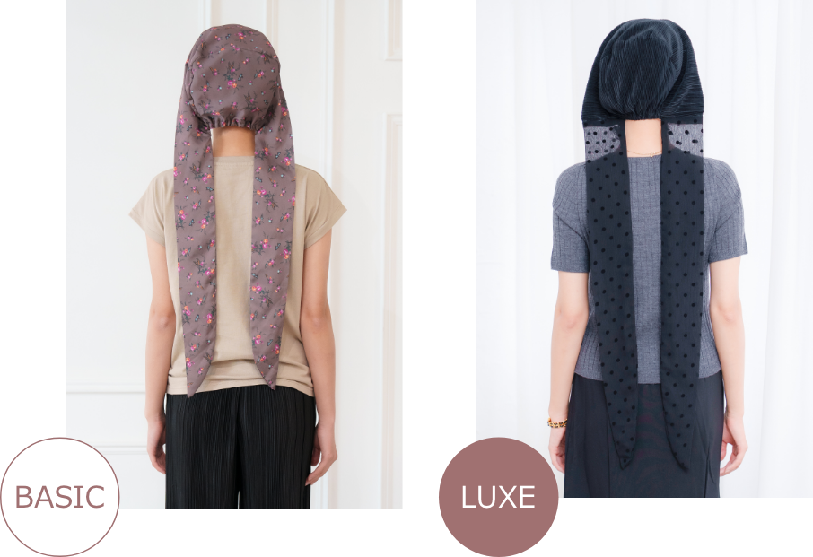 ハリのある生地と、柔らかさにこだわった最高級の2つの生地を切り返すことで、 無地×柄でよりスタイリッシュな印象を実現しました。ベーシックラインより贅沢に生地を使用しているので襟足で結んだ時のボリュームが増え、より華やぎます。 かぶった時の頭のシルエットにも徹底的にこだわり、帽子のようにお手軽にかぶっていただけます。