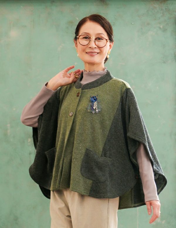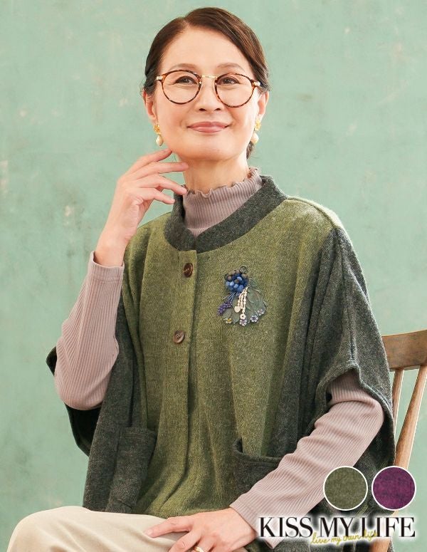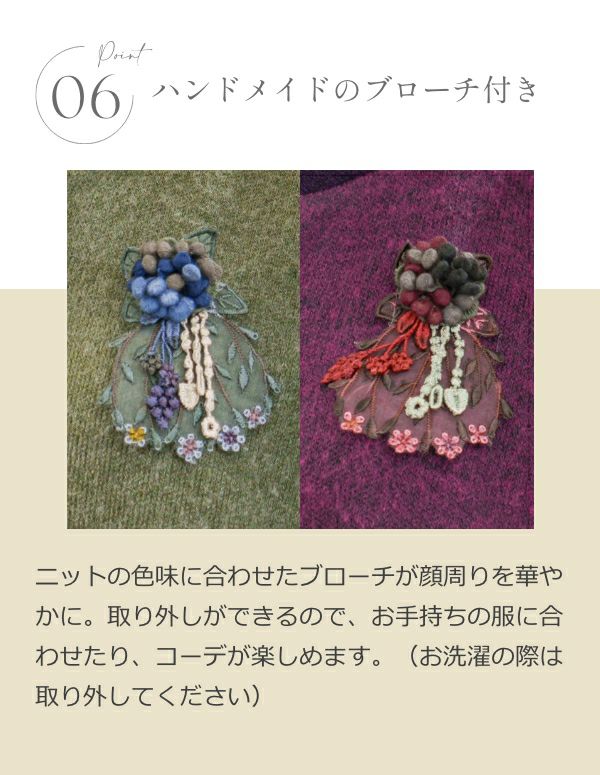 ニットの色味に合わせたブローチが顔周りを華やかに。取り外しができるので、お手持ちの服に合わせたり、コーデが楽しめます。(お洗濯の際は取り外してください)