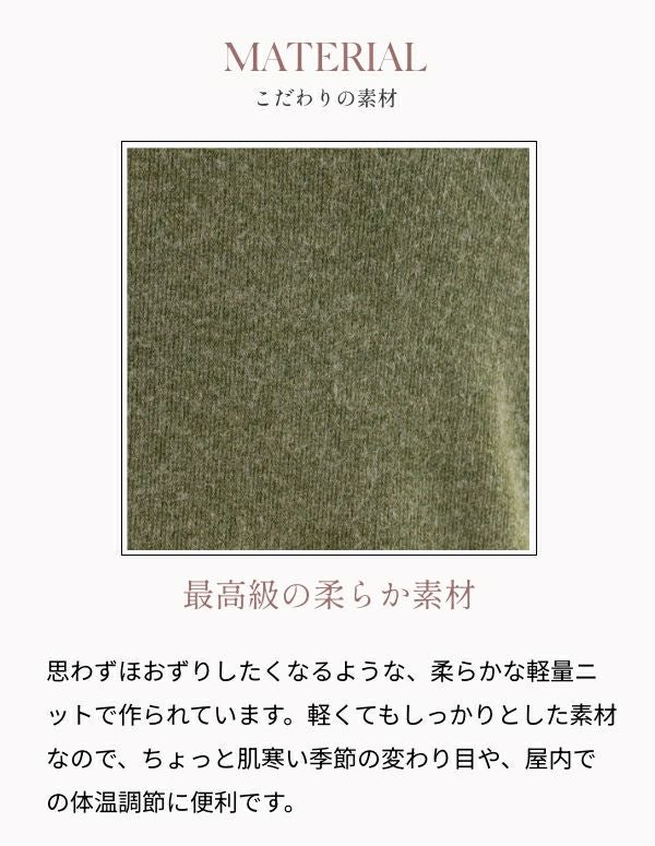 思わずほおずりしたくなるような、柔らかな軽量ニットで作られています。軽くてもしっかりとした素材なので、ちょっと肌寒い季節の変わり目や、屋内での体温調節に便利です。