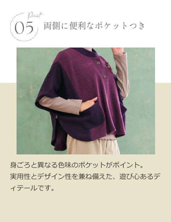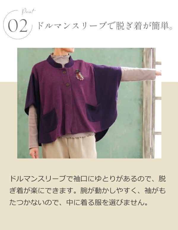 ドルマンスリーブで袖口にゆとりがあるので、脱ぎ着が楽にできます。腕が動かしやすく、袖がもたつかないので、中に着る服を選びません。