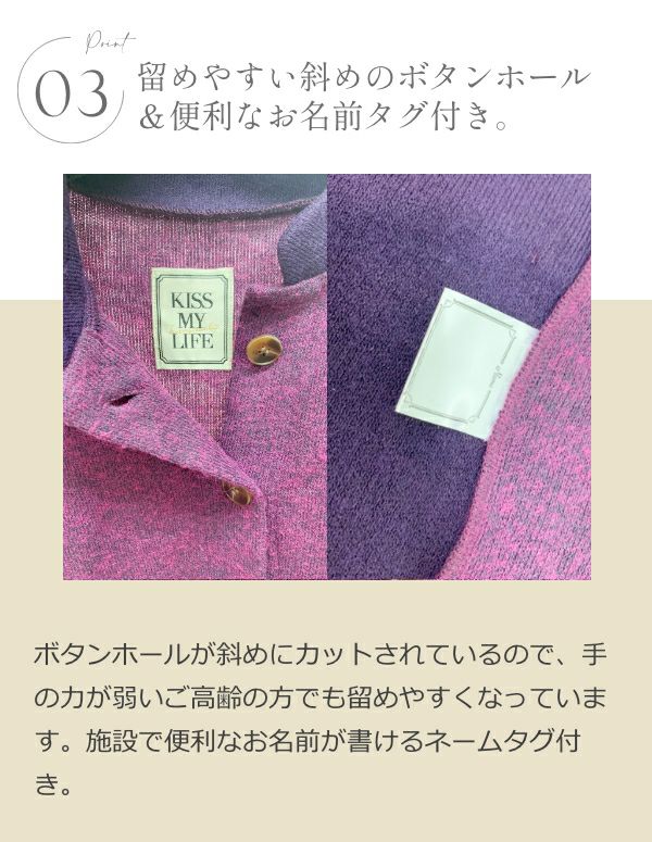 ボタンホールが斜めにカットされているので、手の力が弱いご高齢の方でも留めやすくなっています。 施設で便利なお名前が書けるネームタグ付き。 ※写真は明るめに加工しています