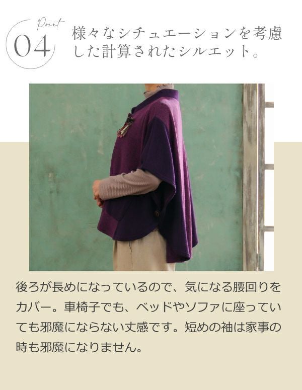 後ろが長めになっているので、気になる腰回りをカバー。車椅子でも、ベッドやソファに座っていても邪魔にならない丈感です。短めの袖は家事の時も邪魔になりません。