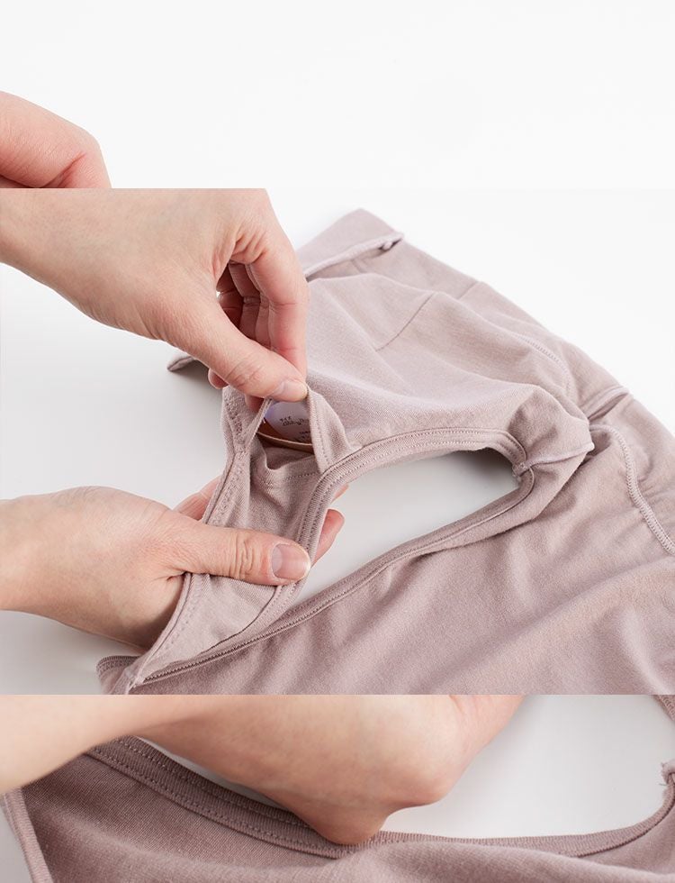 ◎前開きで、ワンタッチでとめられるスナップボタンを使用。