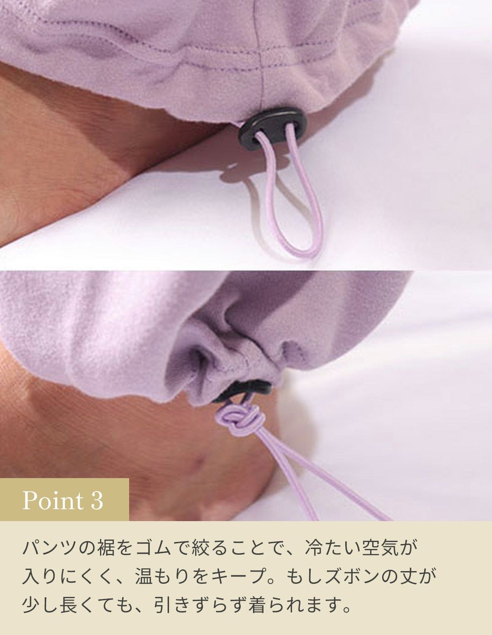 パンツの裾ゴムを絞ることで、冷たい空気が入りにくく、温もりをキープ。もしズボン丈が長くても、引きずりにくい仕様。