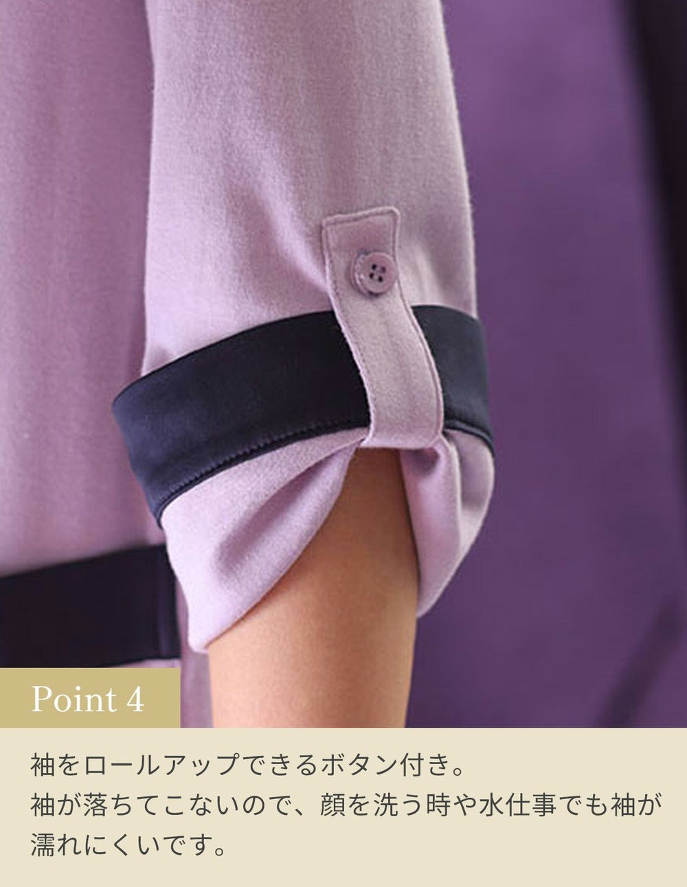 袖をロールアップできるボタン付き。袖が落ちてこないので、顔を洗う時や水仕事でも袖が濡れにくいです。