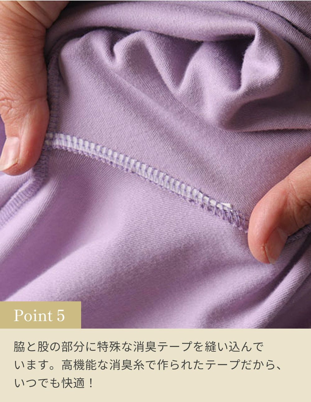 脇と股の部分に特殊な消臭テープを縫い込んでいます。高機能な消臭糸で作られたテープだから、いつでも快適!