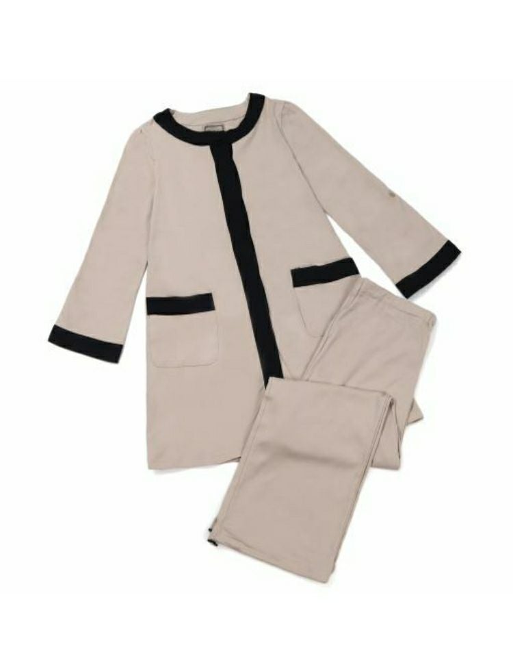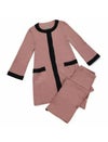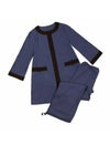 太めのパイピングと丸いボタンで大人可愛く。バイカラーの縁取りがあることで顔周りが華やかに!