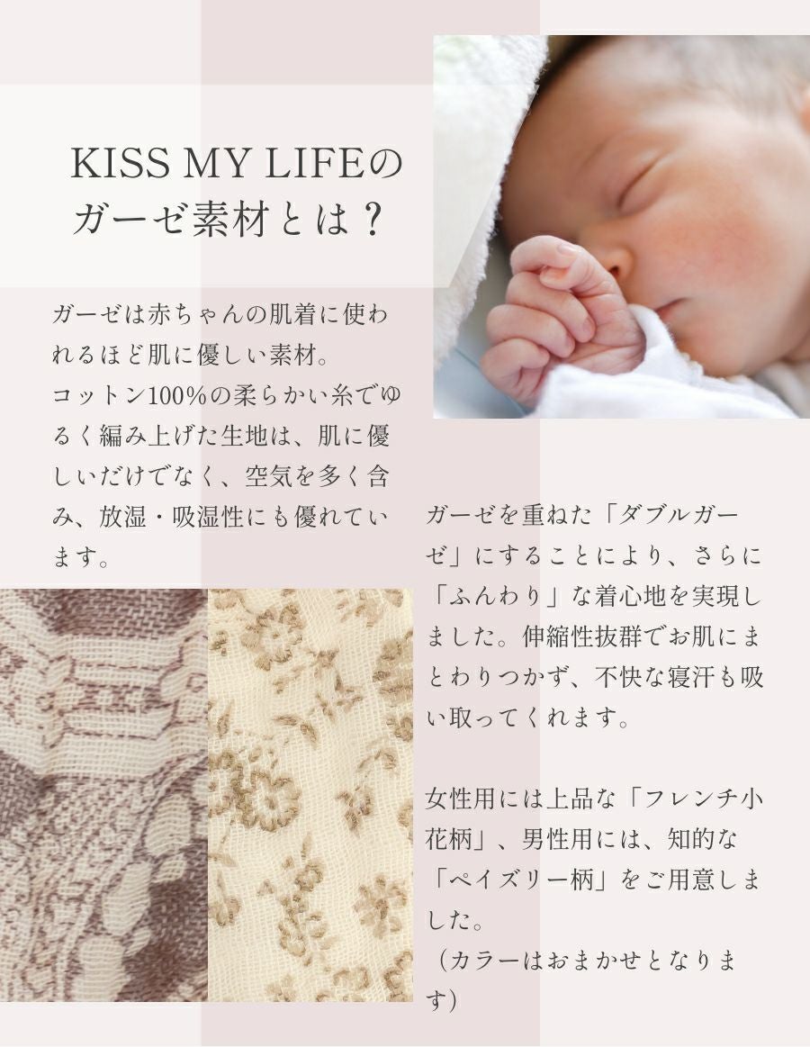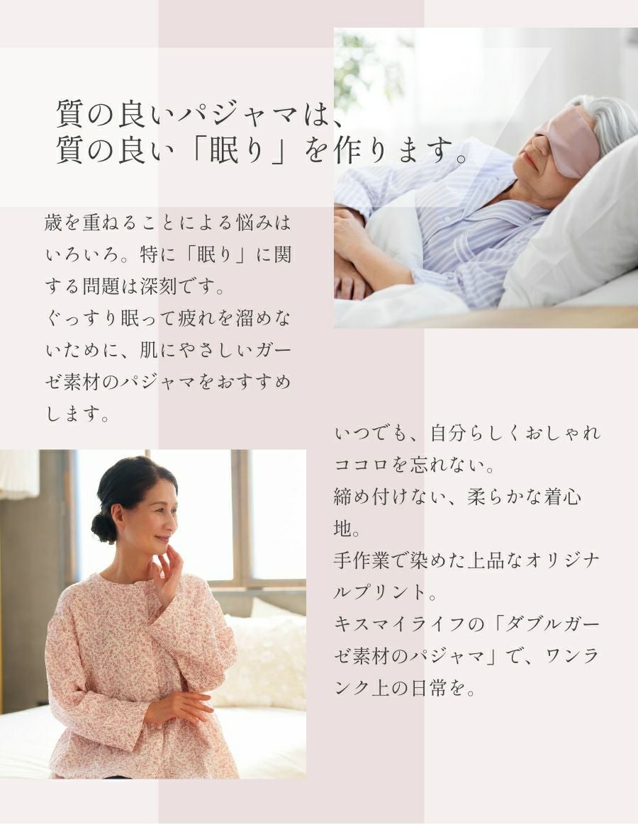 いつでも、自分らしくおしゃれココロを忘れない。 締め付けない、柔らかな着心地。 手作業で染めた上品なオリジナルプリント。 キスマイライフの「ダブルガーゼ素材のパジャマ」で、ワンランク上の日常を。