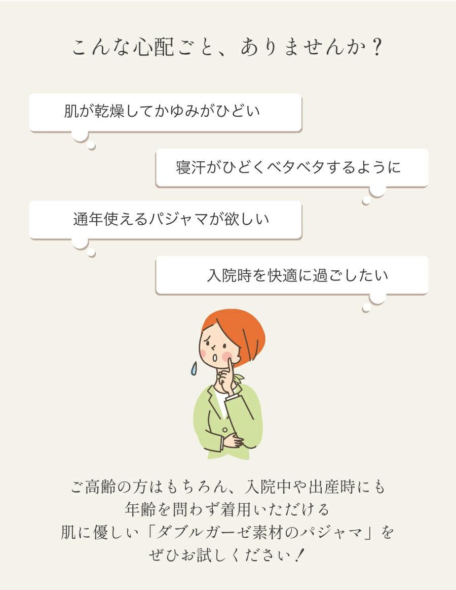 ご高齢の方はもちろん、 入院中や出産時にも 年齢を問わず着用いただける、 「ダブルガーゼ素材のパジャマ」を ぜひお試しください!