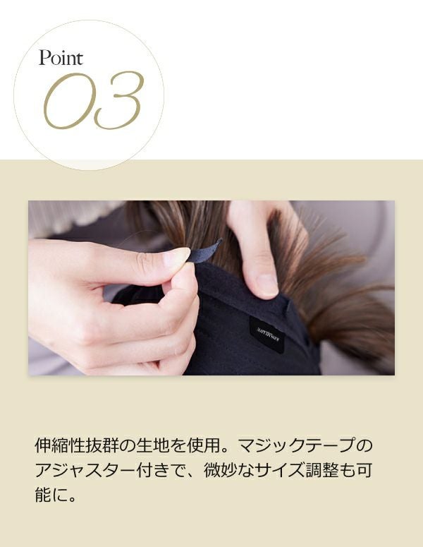 伸縮性抜群の生地を使用。マジックテープのアジャスター付きで、