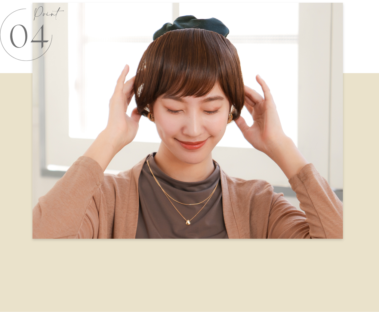 医療用帽子とセットで着用することで、カチューシャウィッグがより自然に!