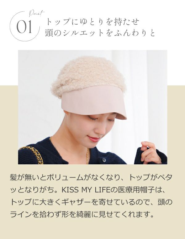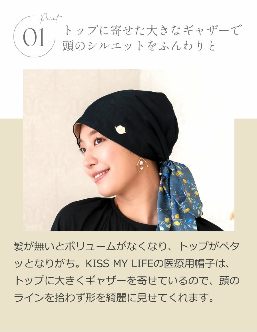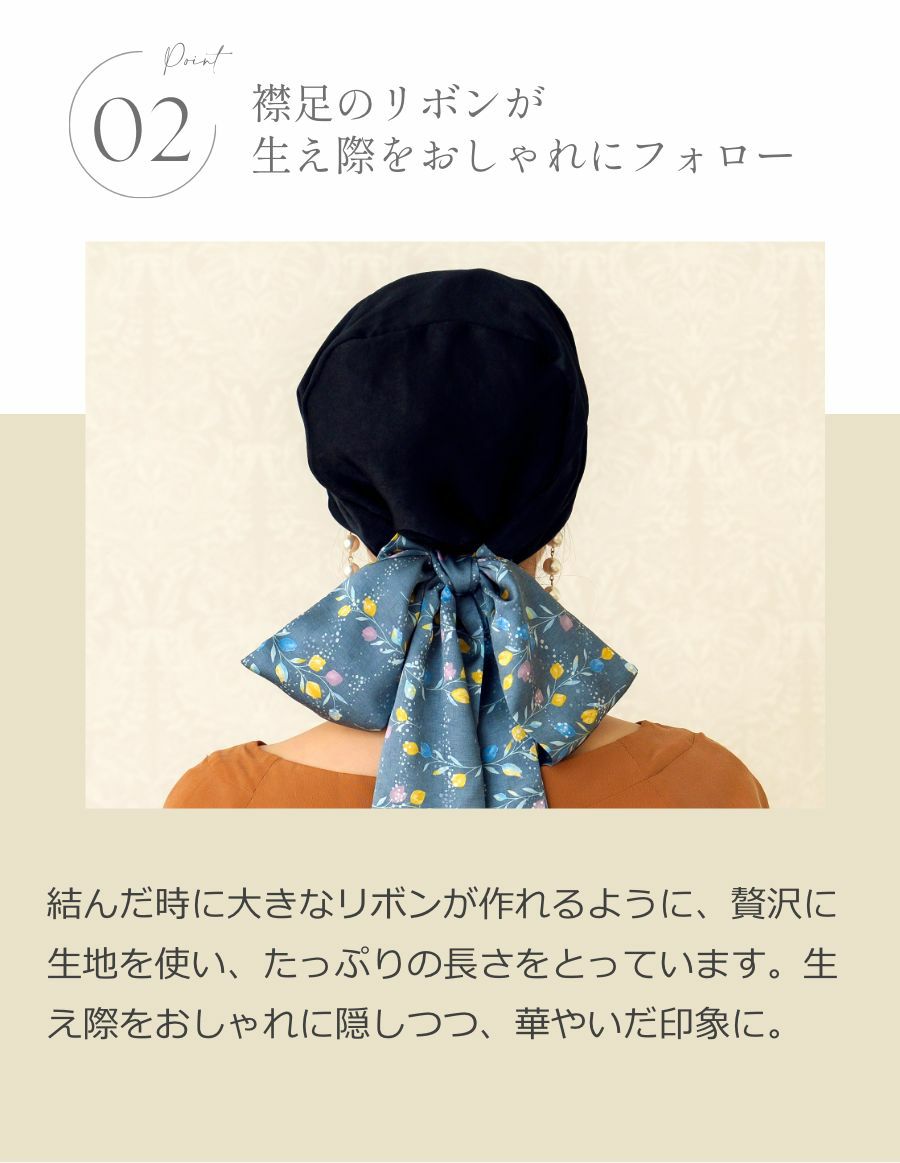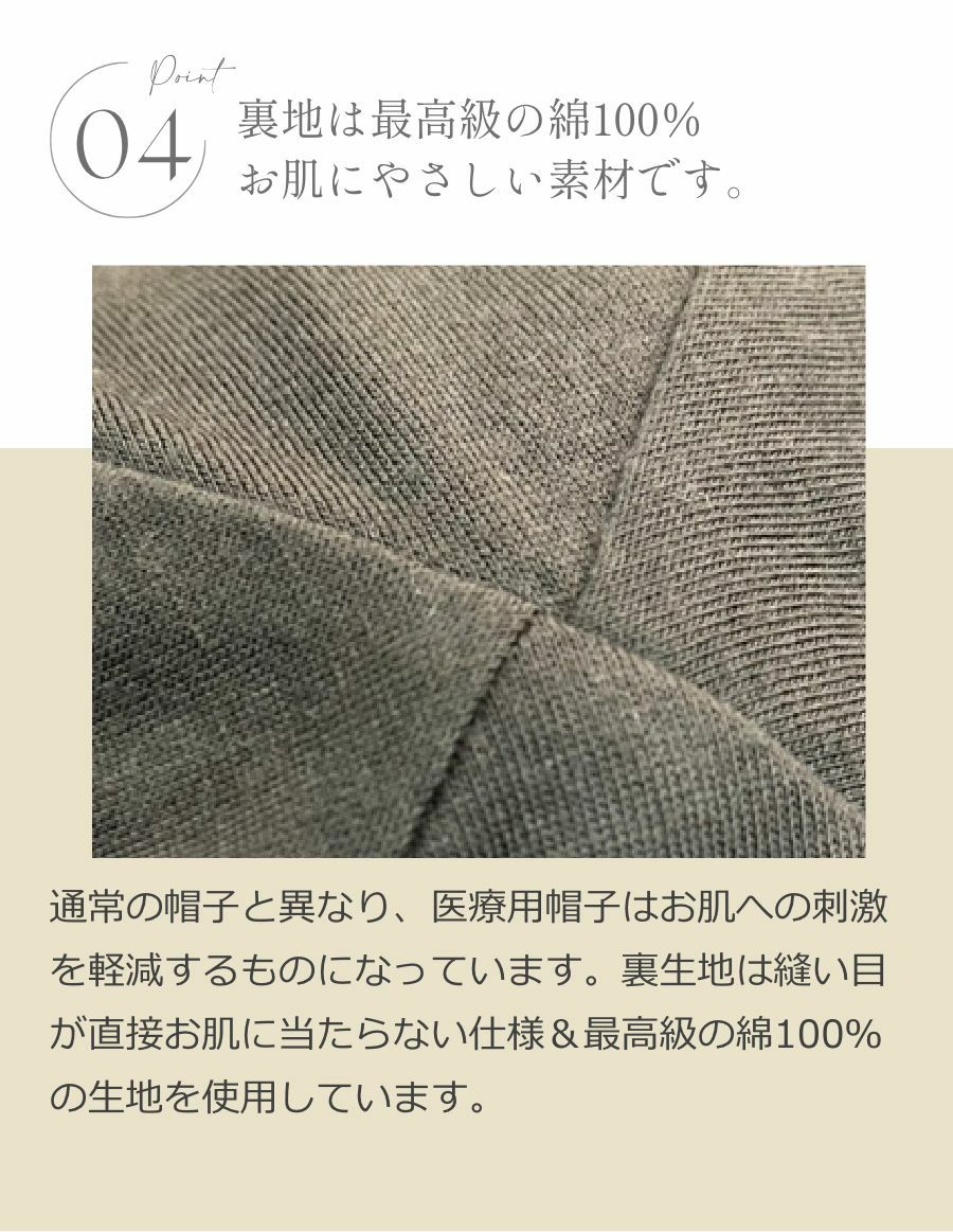 ふわっと被れて優しい被り心地。裏生地も薄い綿素材を使い、頭の形をきれいに見せながらも、軽量で通気性のあるケア帽子です。