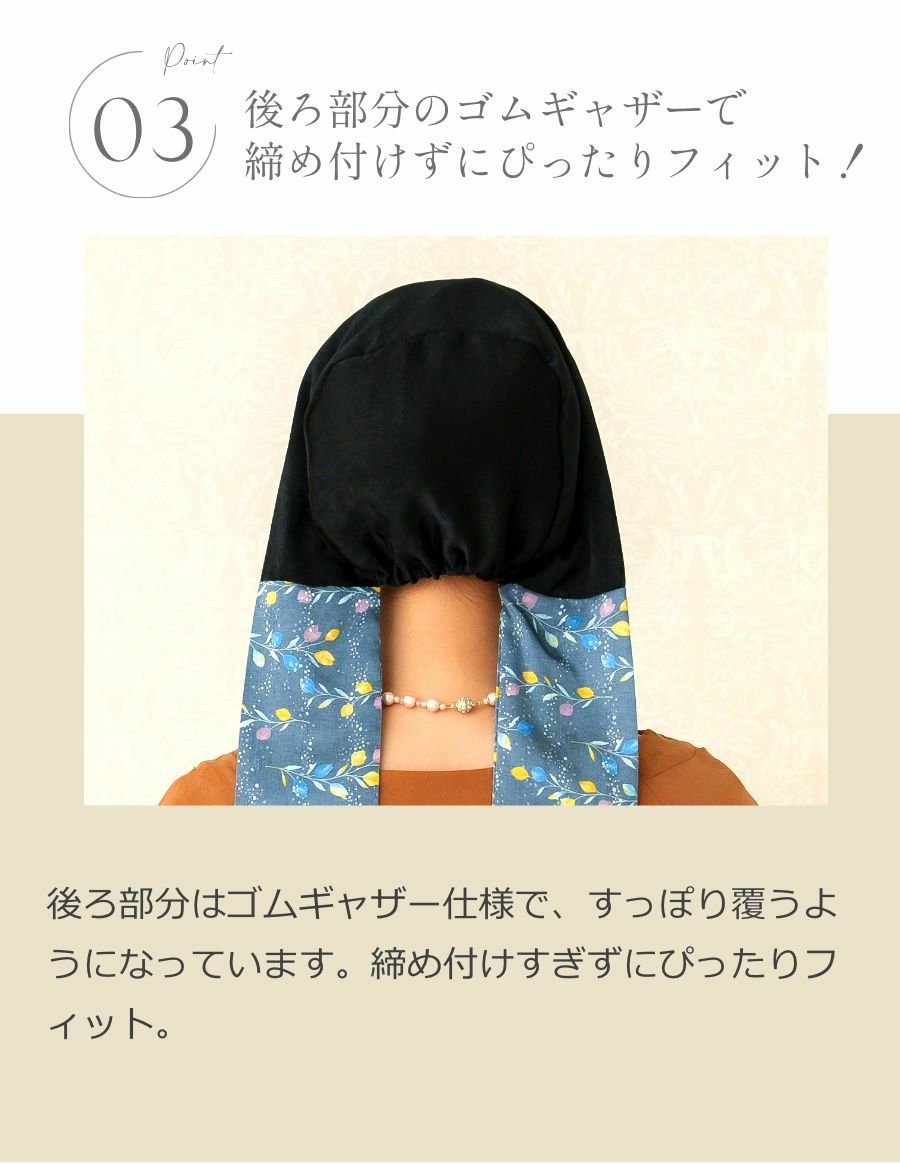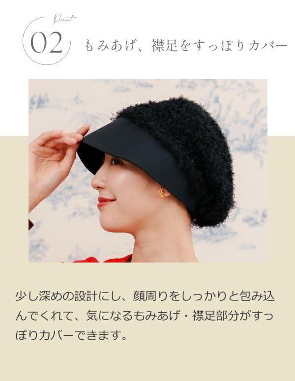 少し深めの設計で顔周りをしっかりと包み込みます。気になるもみあげ・襟足部分もすっぽりカバー。