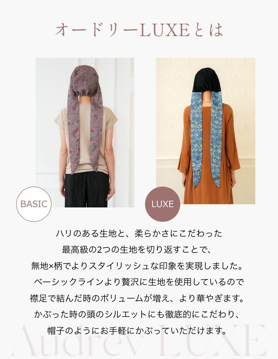 通常のAudreyよりリボン部分が長めの仕様で、結び方がより自由自在に!横で結えたり、前で大きなリボン結びをしたりと、色々なアレンジを楽しんでいただけます。