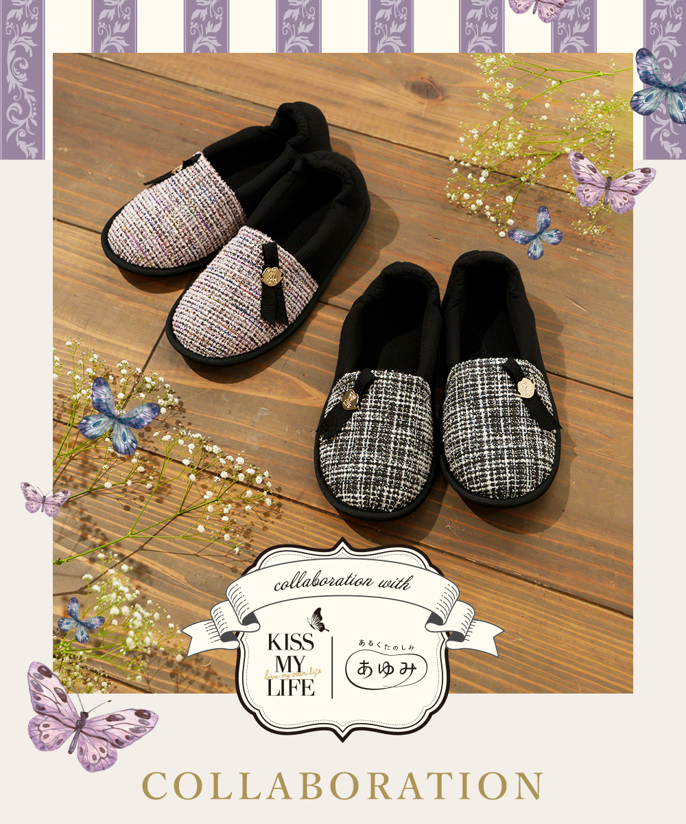 フォーマルでエレガントなツイード生地を『KISS MY LIFE』独自のデザインで機能性も兼ね備えたワンランク上のおしゃれなケアシューズに落とし込みました。