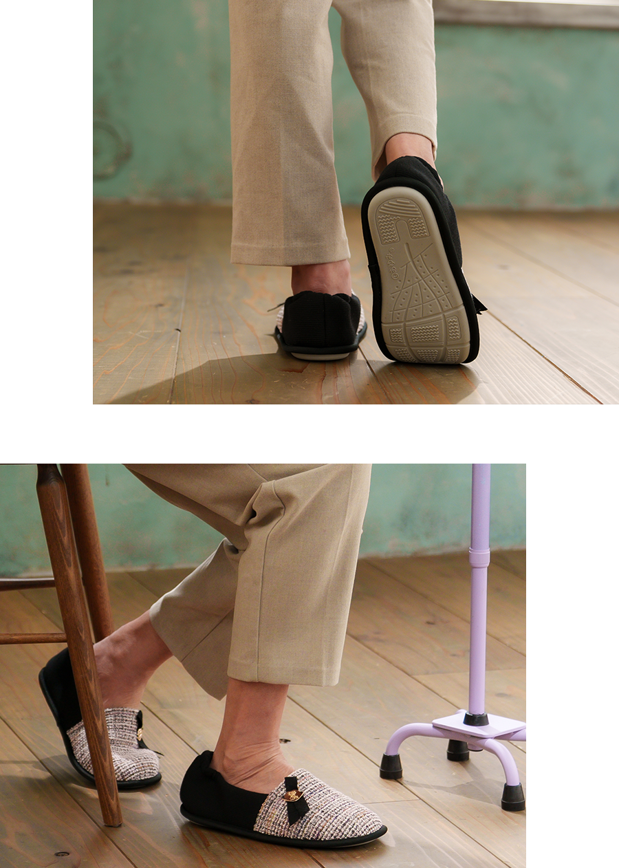 施設のお部屋履きとして、長距離移動の乗り物のお供に、屋内でのイベント時の上履きとして、締め付け感なく足にフィットし、脱ぎ履きもしやすく足入れもノンストレスでご利用いただけます。