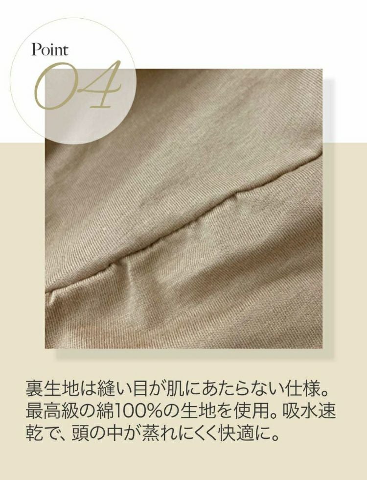 最高級の綿100%の生地を使用。吸水速乾で、頭の中が蒸れにくく快適に。