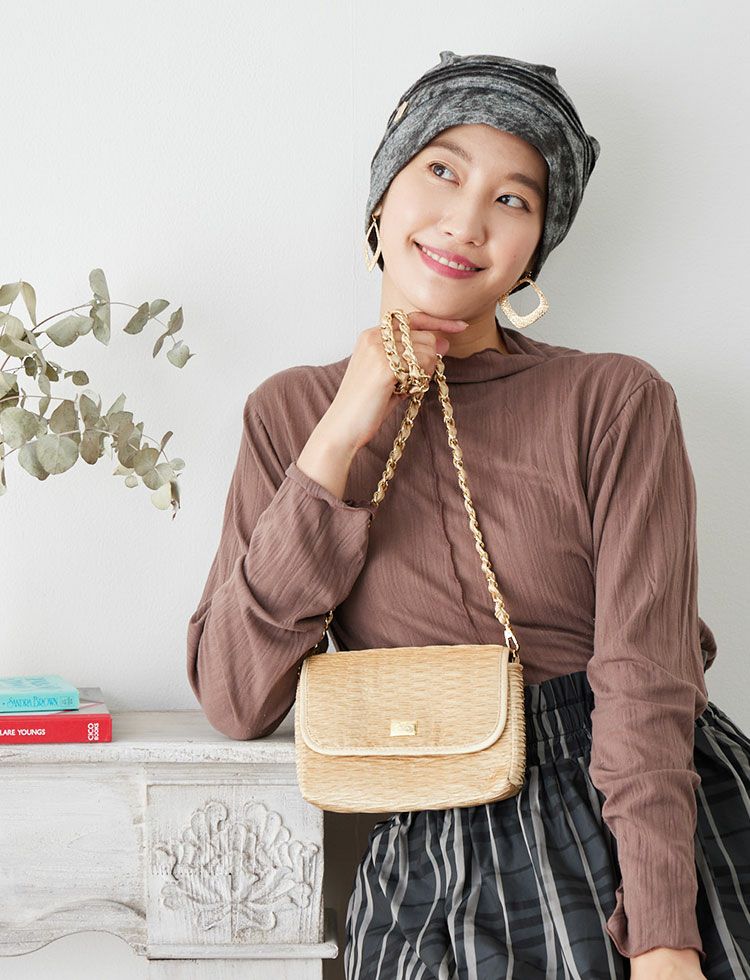 すこしサイズが大きいのか、被っているうちにぐるっと動いてしまうのですが、右側にさりげなく付いているチャームを目印に、位置を直せるのがいいなと思いました。