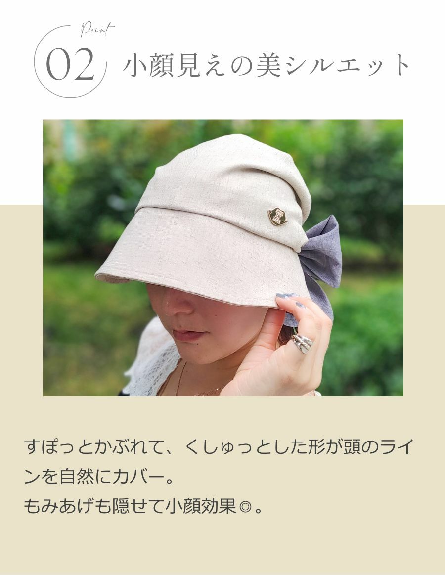 つばで顔まわりを、後ろのフリルでうなじまで紫外線をしっかりガード。 ※リボンなしでも、シンプルに着用いただけます。
