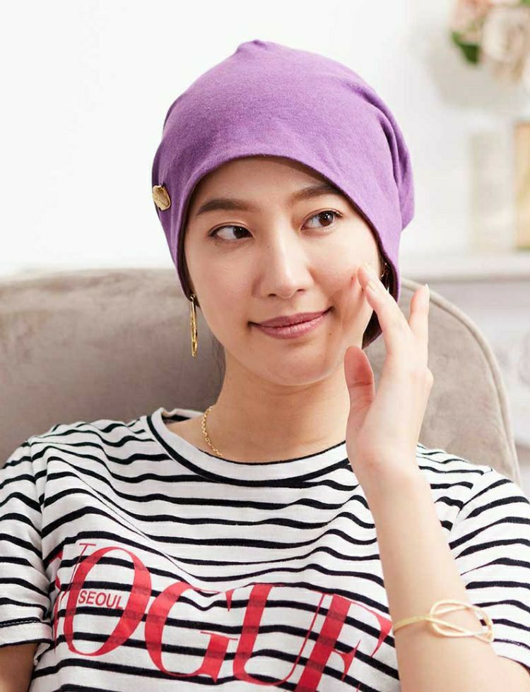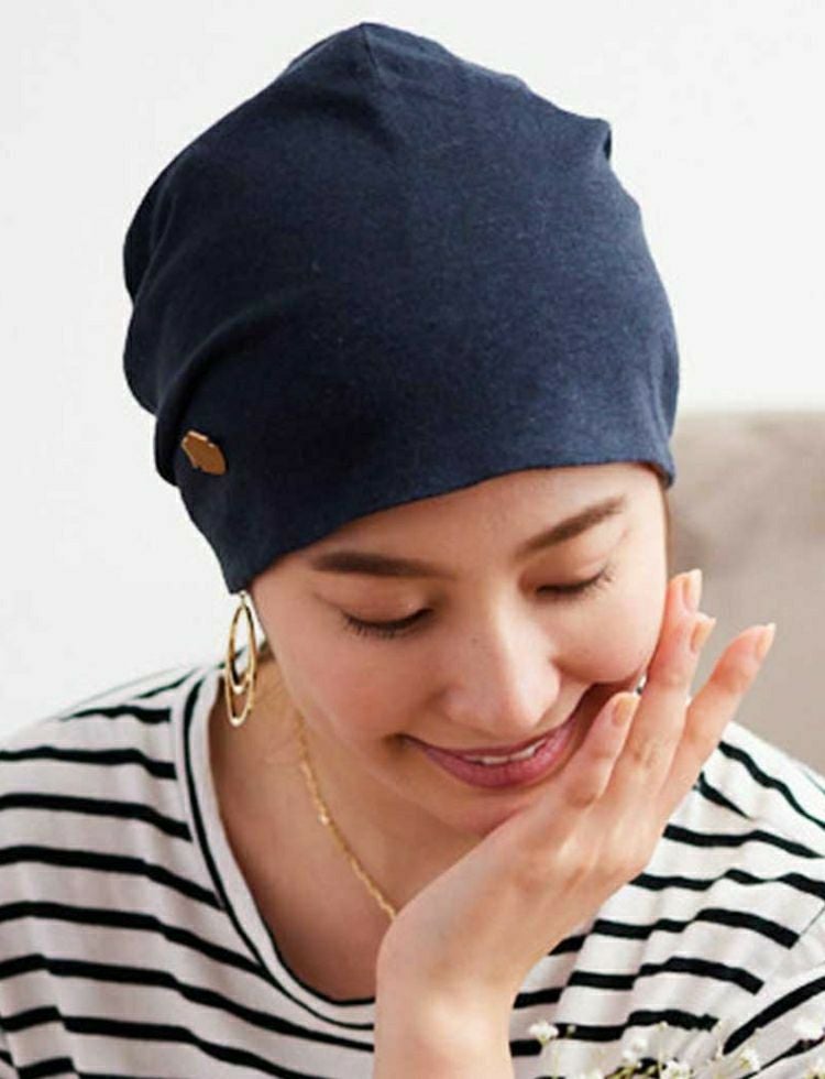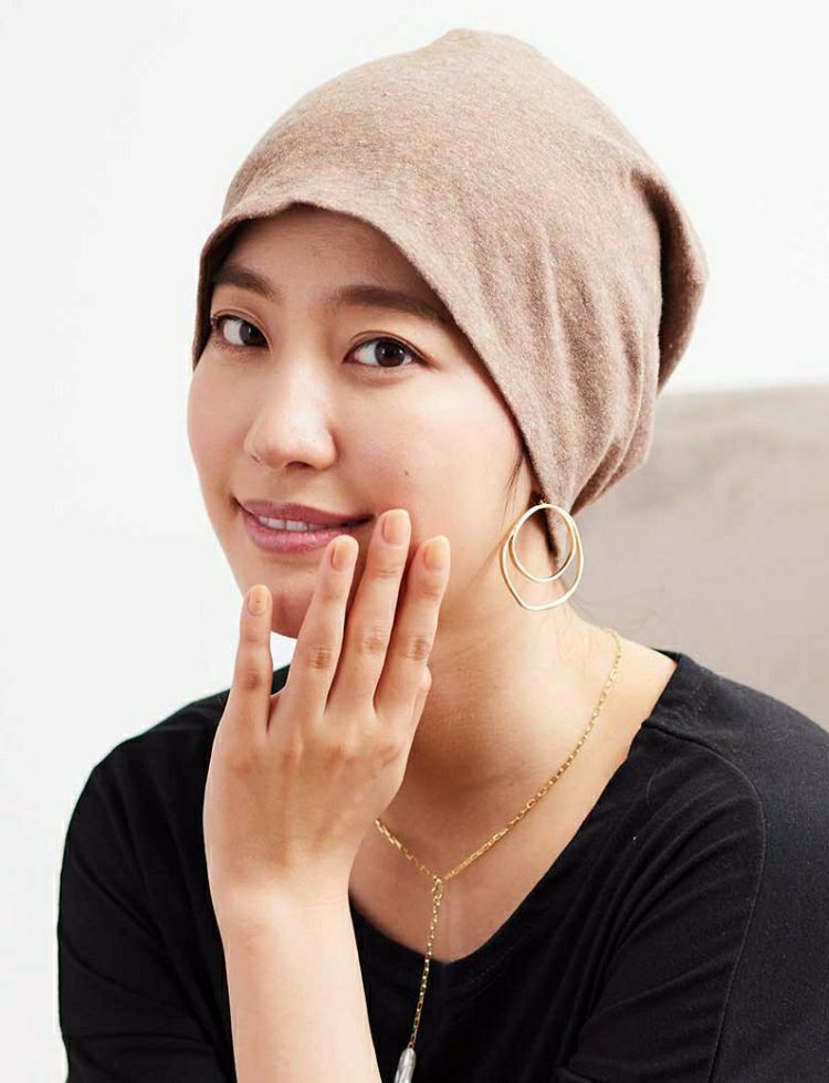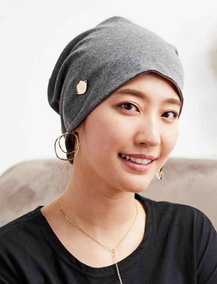 髪がなくニット帽子を被るとペタッとしちゃうので、クシュっと被れて小顔効果もUP!