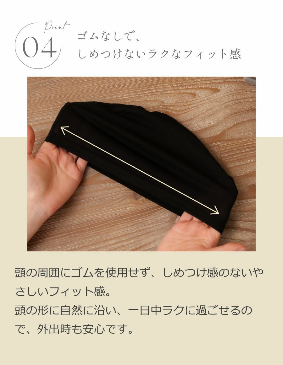 シルクのような滑らかな肌触りと、通気性に優れたモダール素材を使用。 ムレにくく、頭皮を涼しく保ちながらも、優れた快適さを提供します。