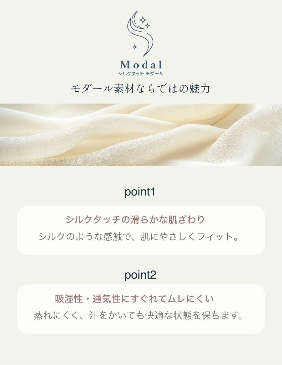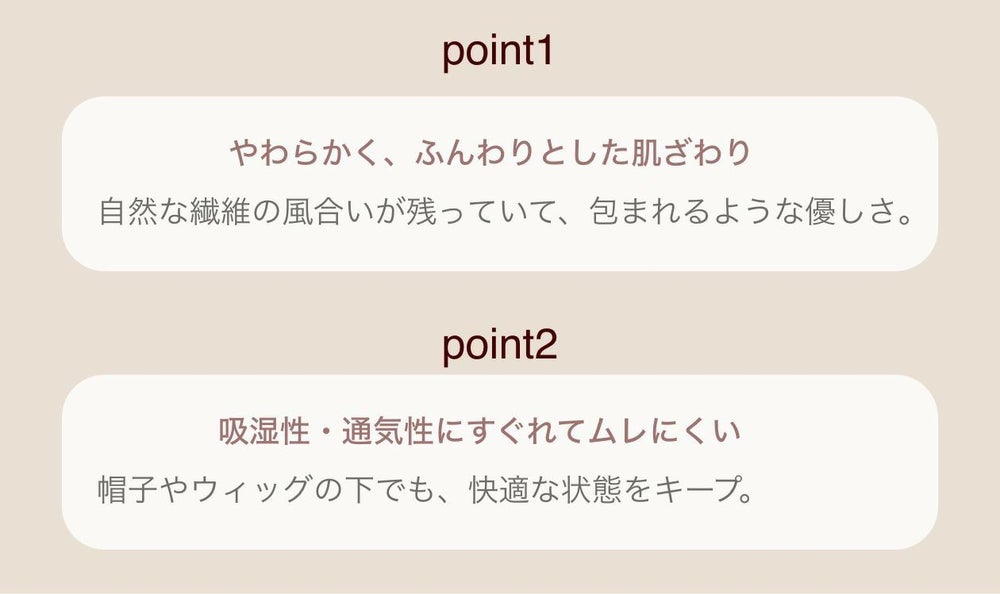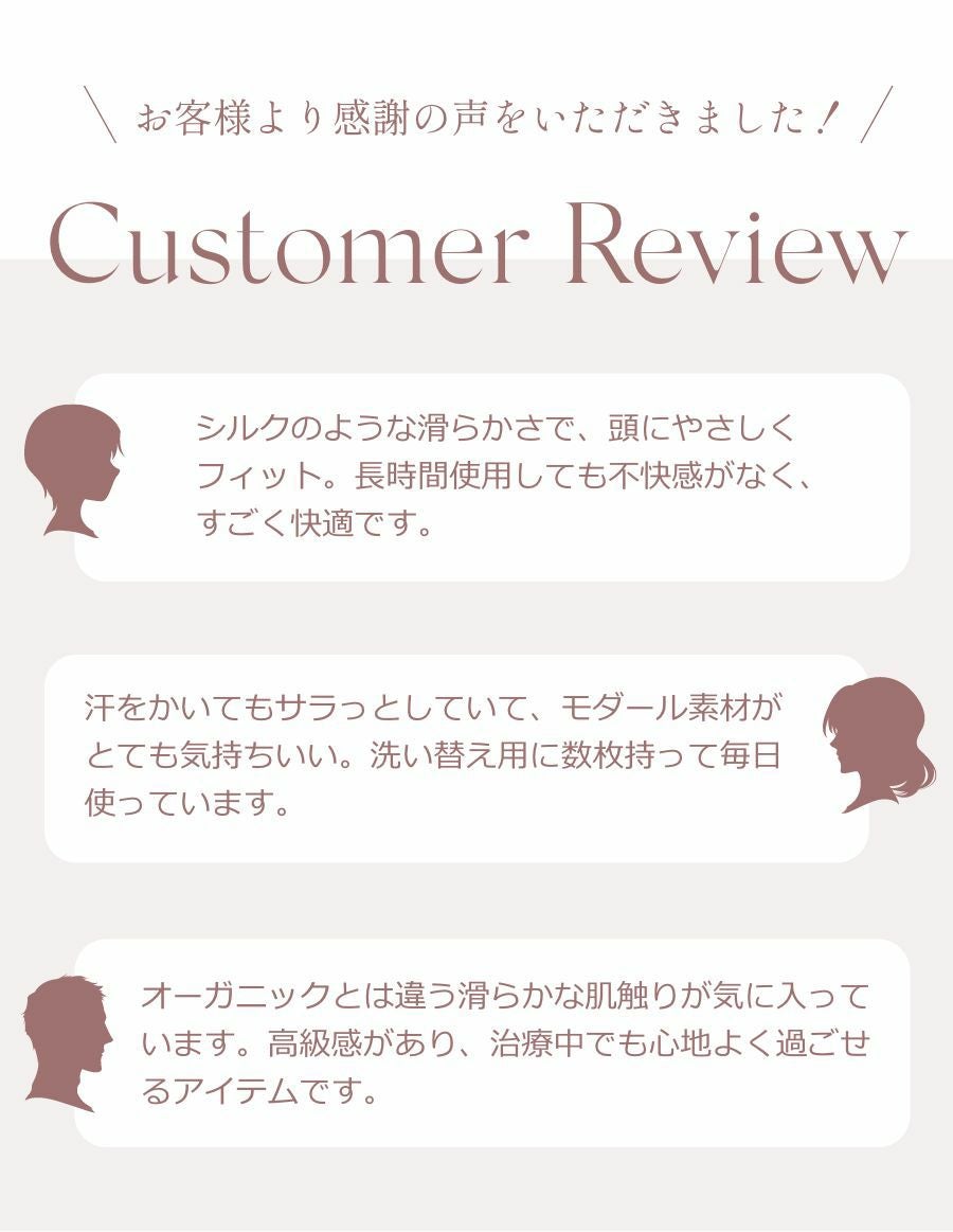 モダール素材は非常に伸びが良く、薄手なので軽やかな着け心地が特徴。 医療用帽子やウィッグの下でも、薄さを感じさせず、快適に過ごせます。