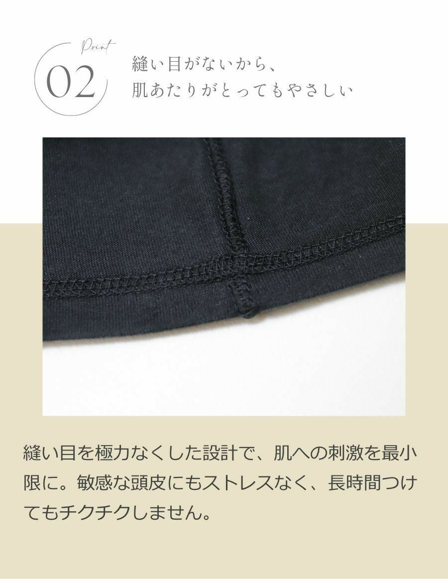縫い目を極力なくした設計で、肌への刺激を最小限に。 敏感な頭皮にもストレスなく、長時間つけてもチクチクしません。