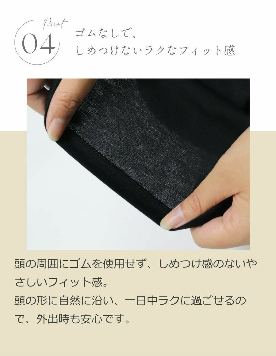 頭の周囲にゴムを使用せず、しめつけ感のないやさしいフィット感。 頭の形に自然に沿い、一日中ラクに過ごせるので、外出時も安心です。