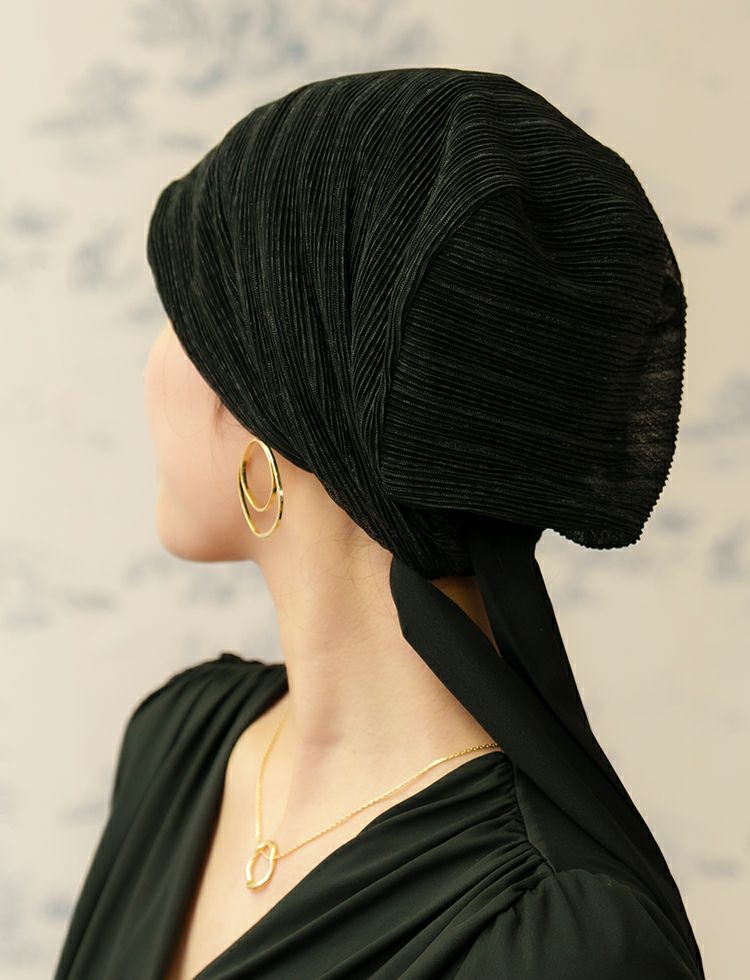 ほんのりラメ感のあるプリーツ素材は、シンプルながら、高級感もあり、どんなお洋服にも合わせやすい、おしゃれな医療用帽子です。