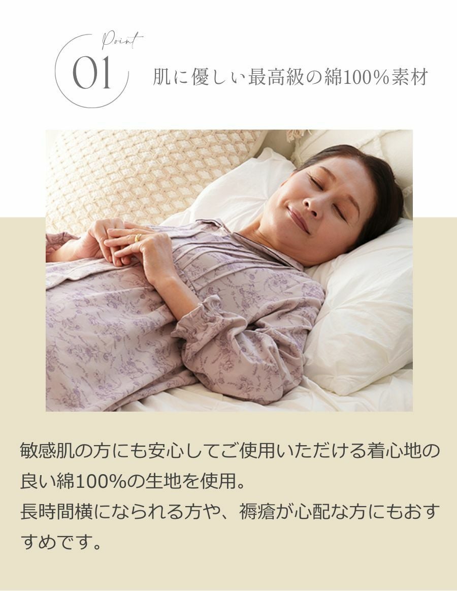 着脱しやすく、Wガーゼ素材やゆったりとしたシルエット、ワンタッチテープなど 細部まで工夫を凝らした仕様で、高齢者の方にも人気です。