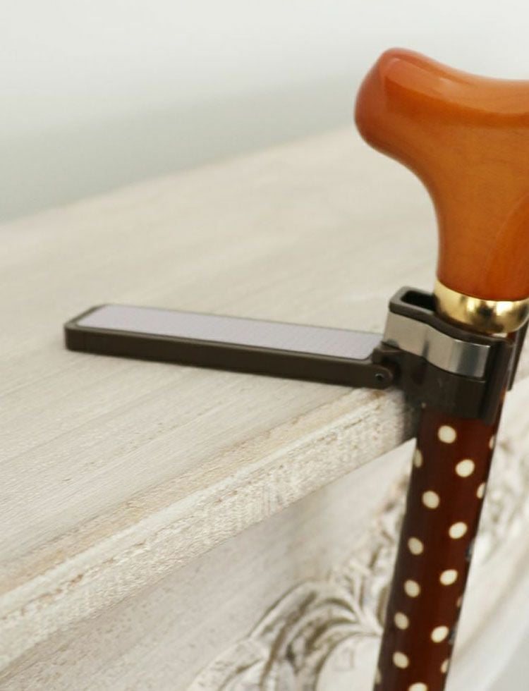 杖から手を離し何か違うことをするときに、よく杖が転倒して困ります。この杖ホルダーをポケットに挟むと、両手が空くので、ちょっとしたことがしやすくて、助かります。磁石を玄関ドアの内側につけてみたら、きちんとつきます。便利な補助道具です。