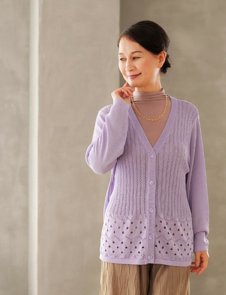 商品について ◎涼しげな透かし柄を施した色鮮やかなカーディガンです