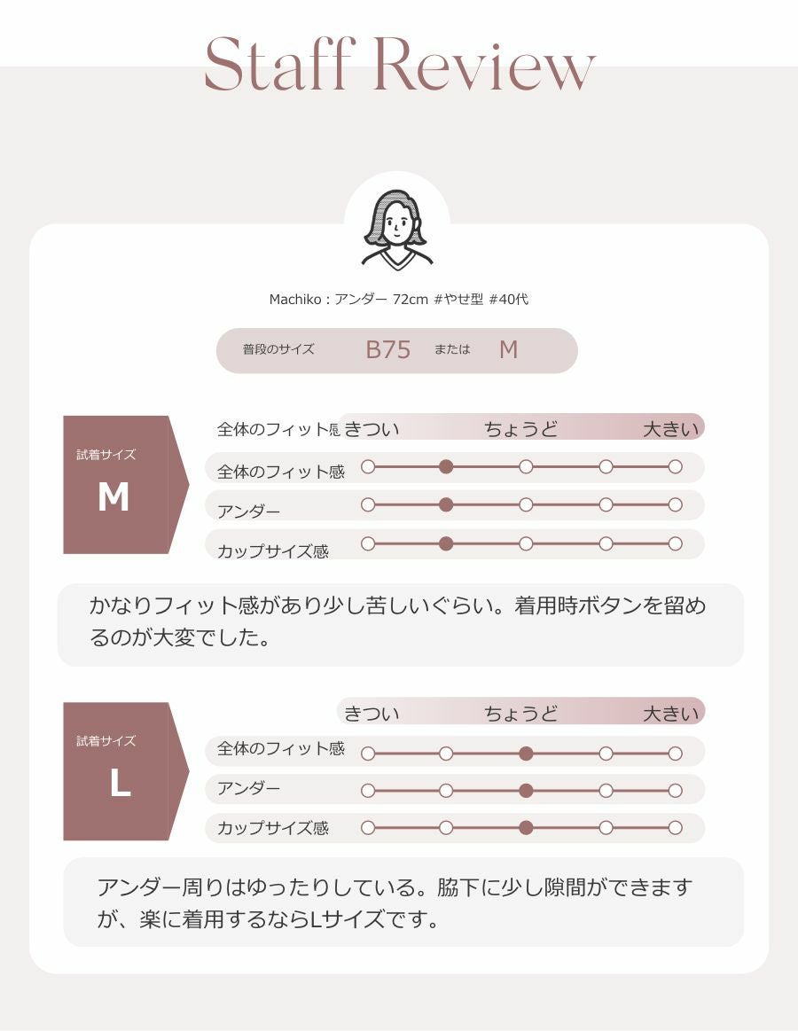 ノンワイヤーで締め付けず、長時間の利用も負担がなく術後も安心です。重いパッドを入れても食い込まず、バストをしっかり固定し安定感があります。