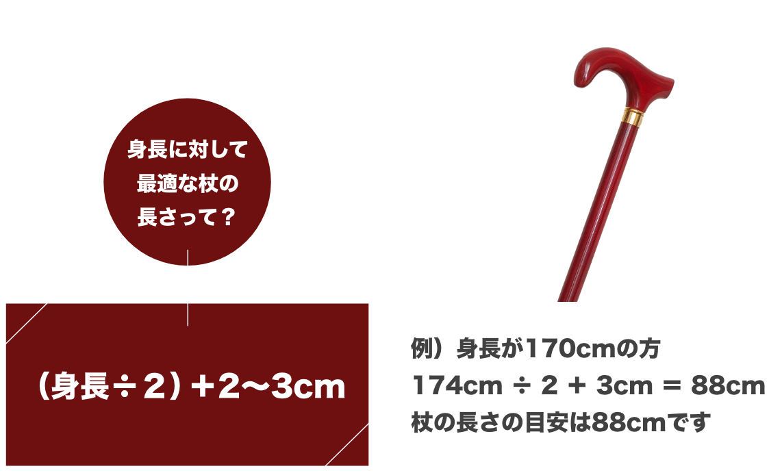 ※杖のご利用者様によって手足の長さなどが異なりますので、あくまでも目安としてご参考ください。 ※サイズカットした商品は返品・交換できませんのでご了承ください。 ※商品最大サイズが90cmで、適正身長が約174cmまでとなり、それ以上のサイズには加工できませんのでご注意ください。