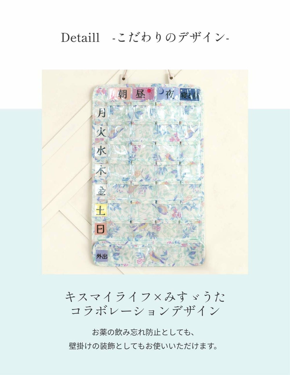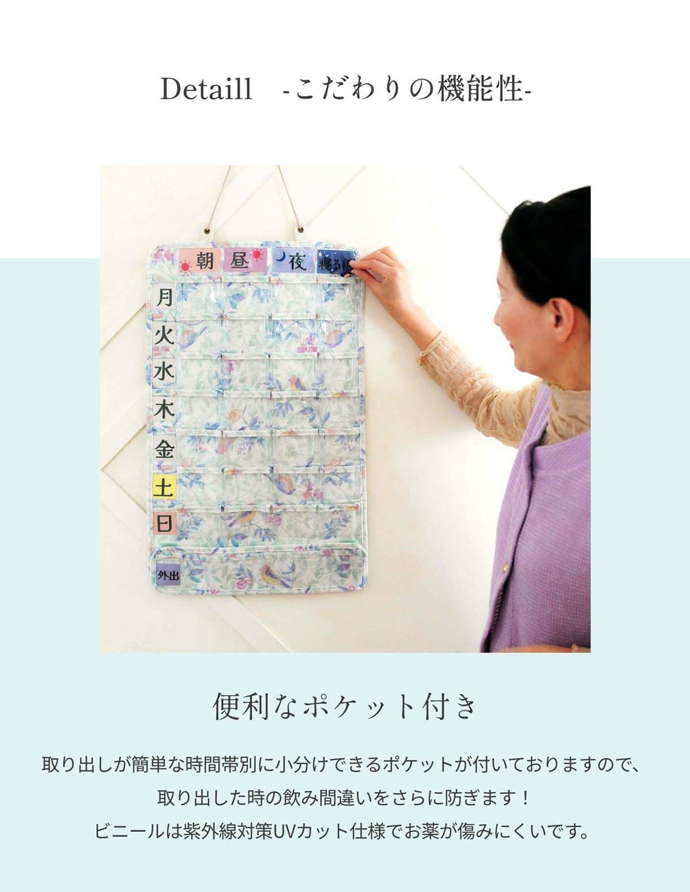 1週間分のお薬は壁掛けで便利に管理できます。