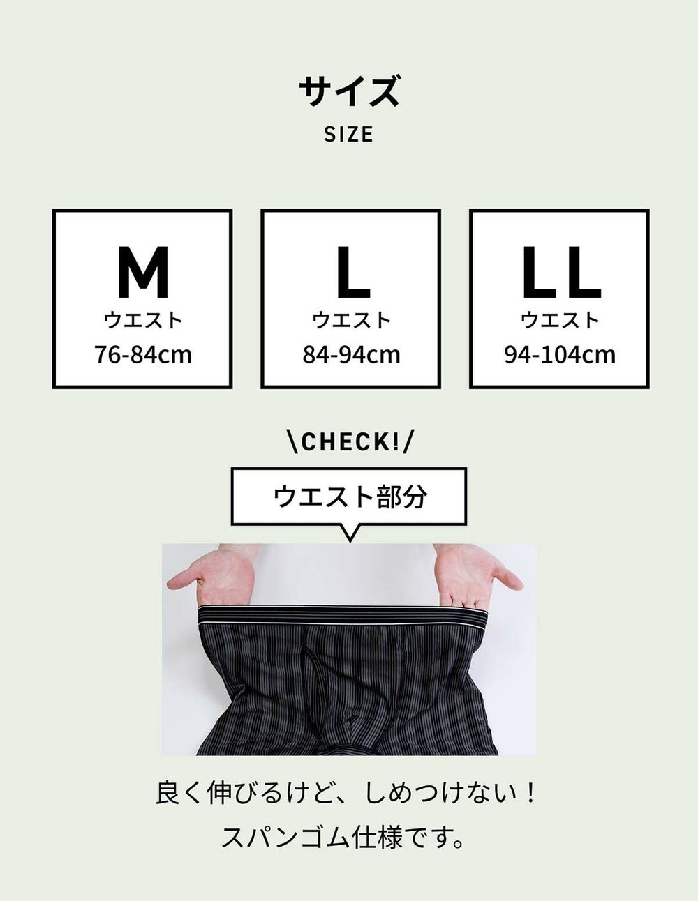 ウエスト部分は肌に優しく伸縮性抜群のスパンゴム。 ウエストの締め付けがなくラクチン!大きく開く前開き仕様で快適さ抜群のパンツです。
